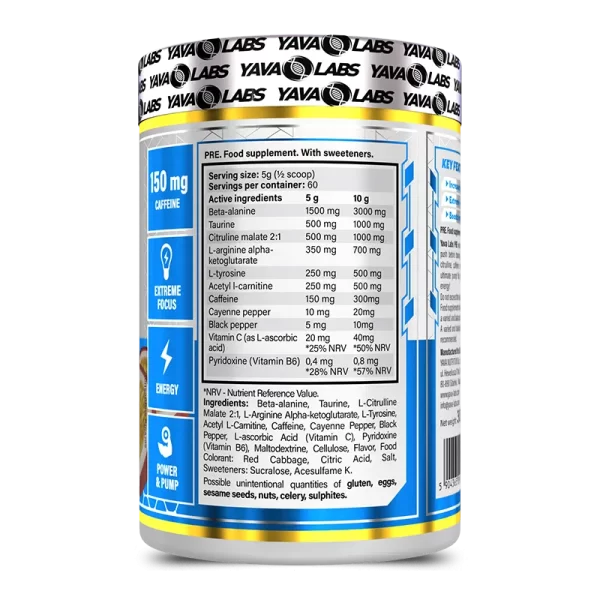 ava Labs PRE Workout is the ultimate supplement you need for an explosive training session. With precise doses of beta-alanine, citrulline, caffeine, and other crucial ingredients, this product is designed to provide you with the ultimate pump! Feel a surge of sustainable energy and experience an increased level of focus, without the jitters. Available in a variety of delicious flavors, Yava Labs PRE Workout is the perfect solution to power up your workout regimen.
